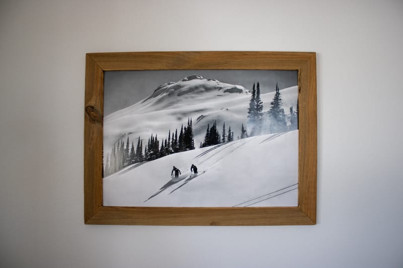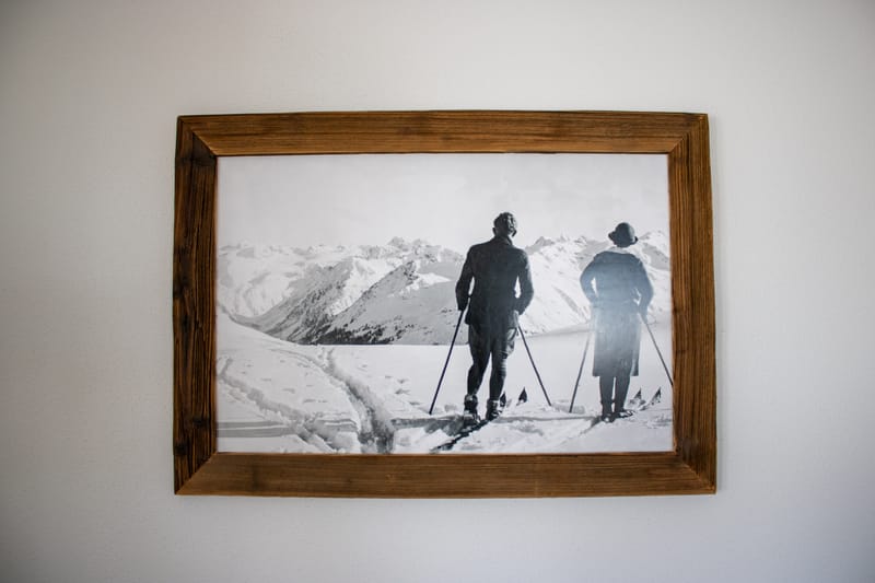 Wandbild mit Altholz und Metallrahmen Maße Höhe x Breite 40x40cm Tiefe 12cm Bild: Skifahrer am Hang